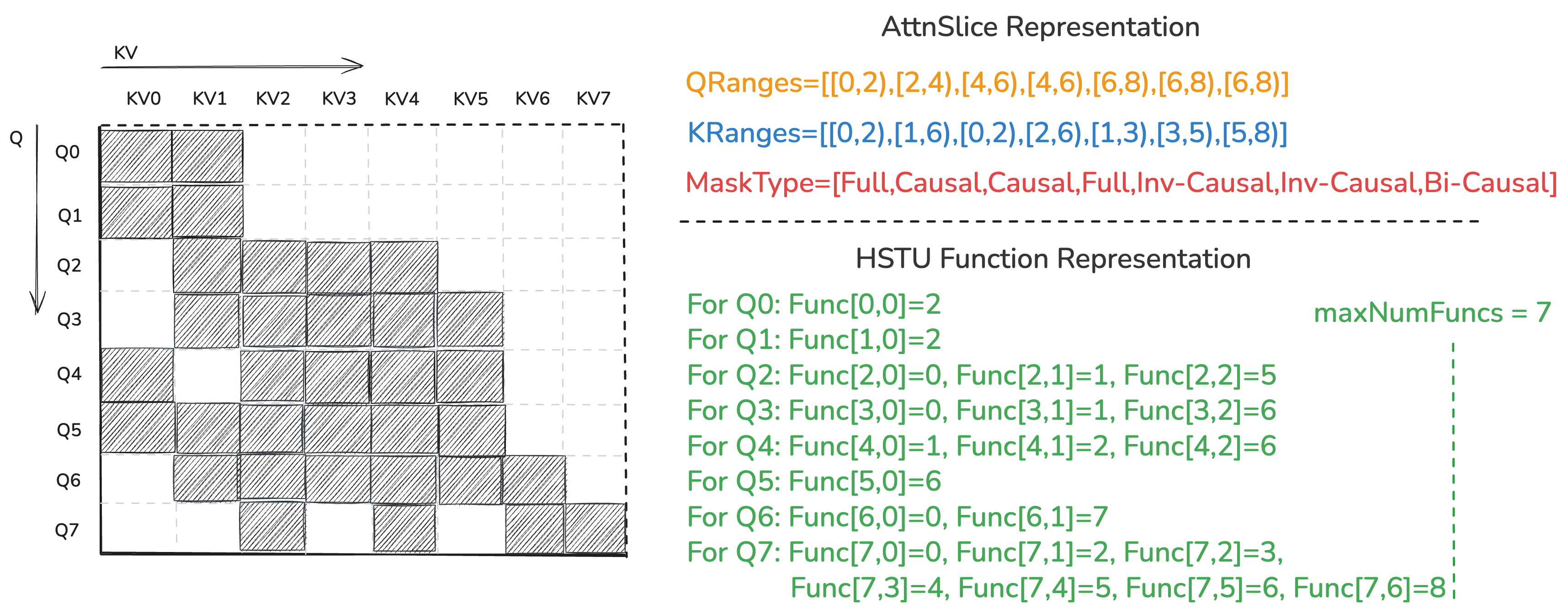 Fig. 65 Example of HSTU Function representation compared to AttnSlice representation for an irregular attention mask pattern.#