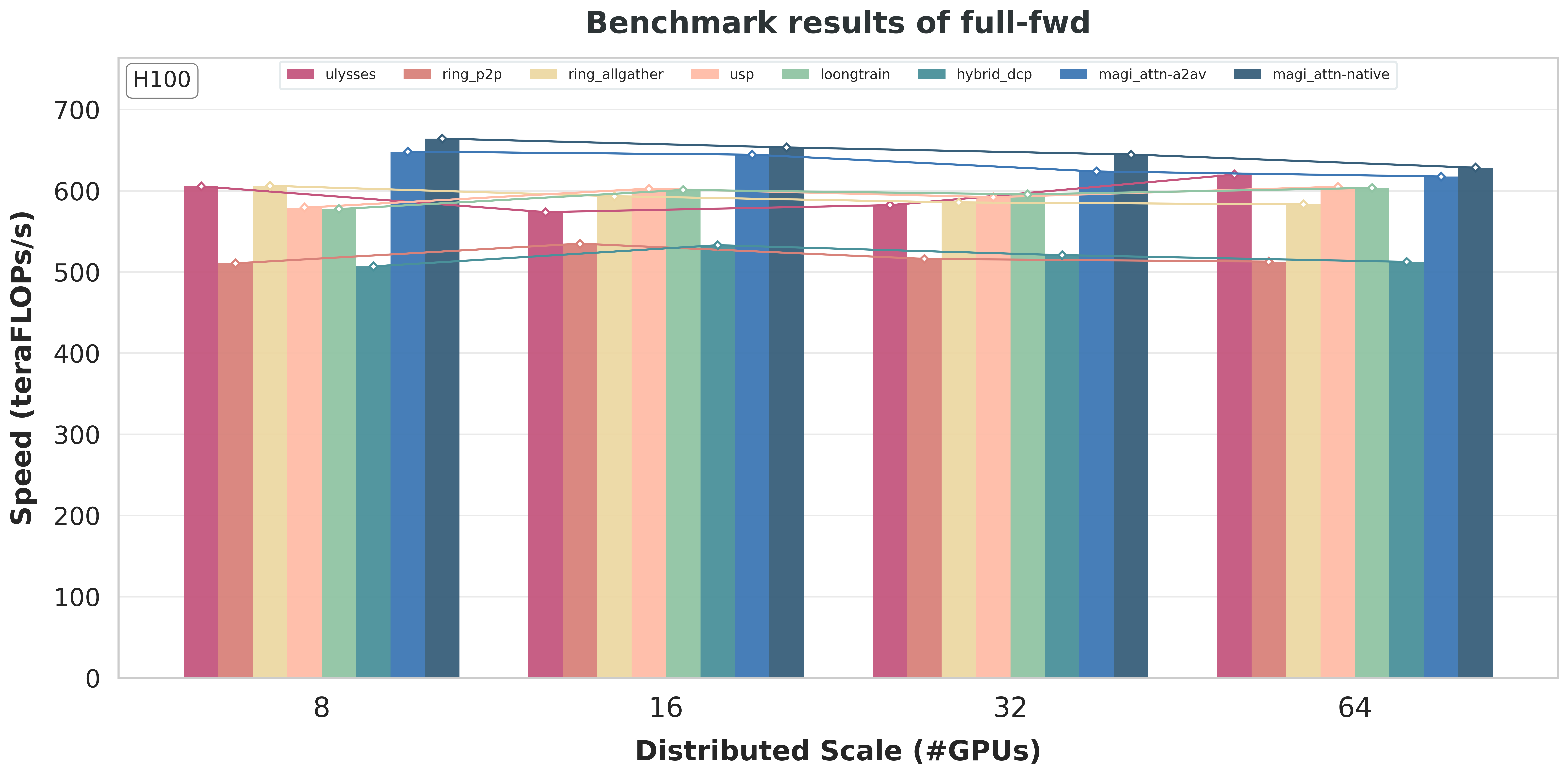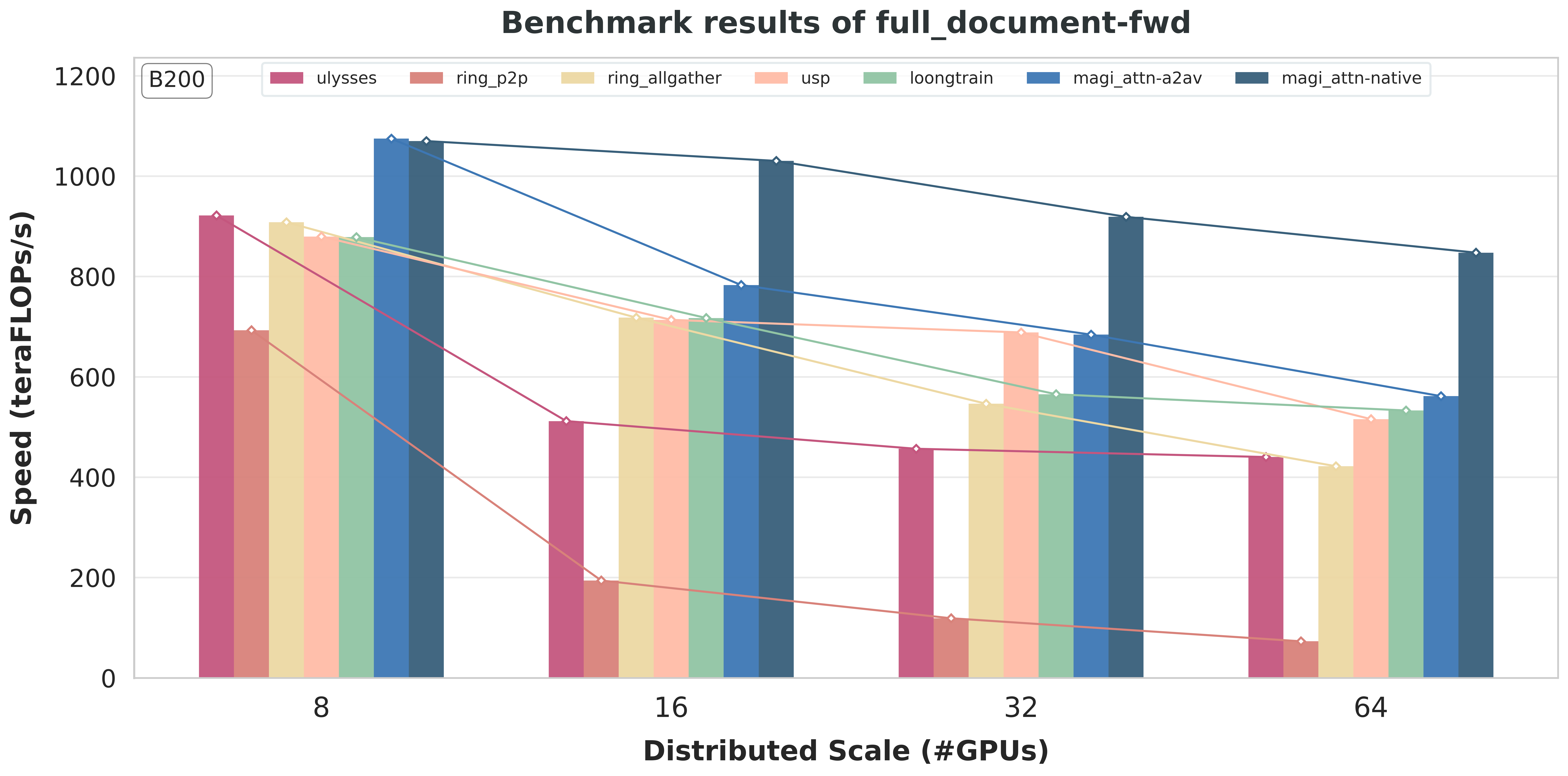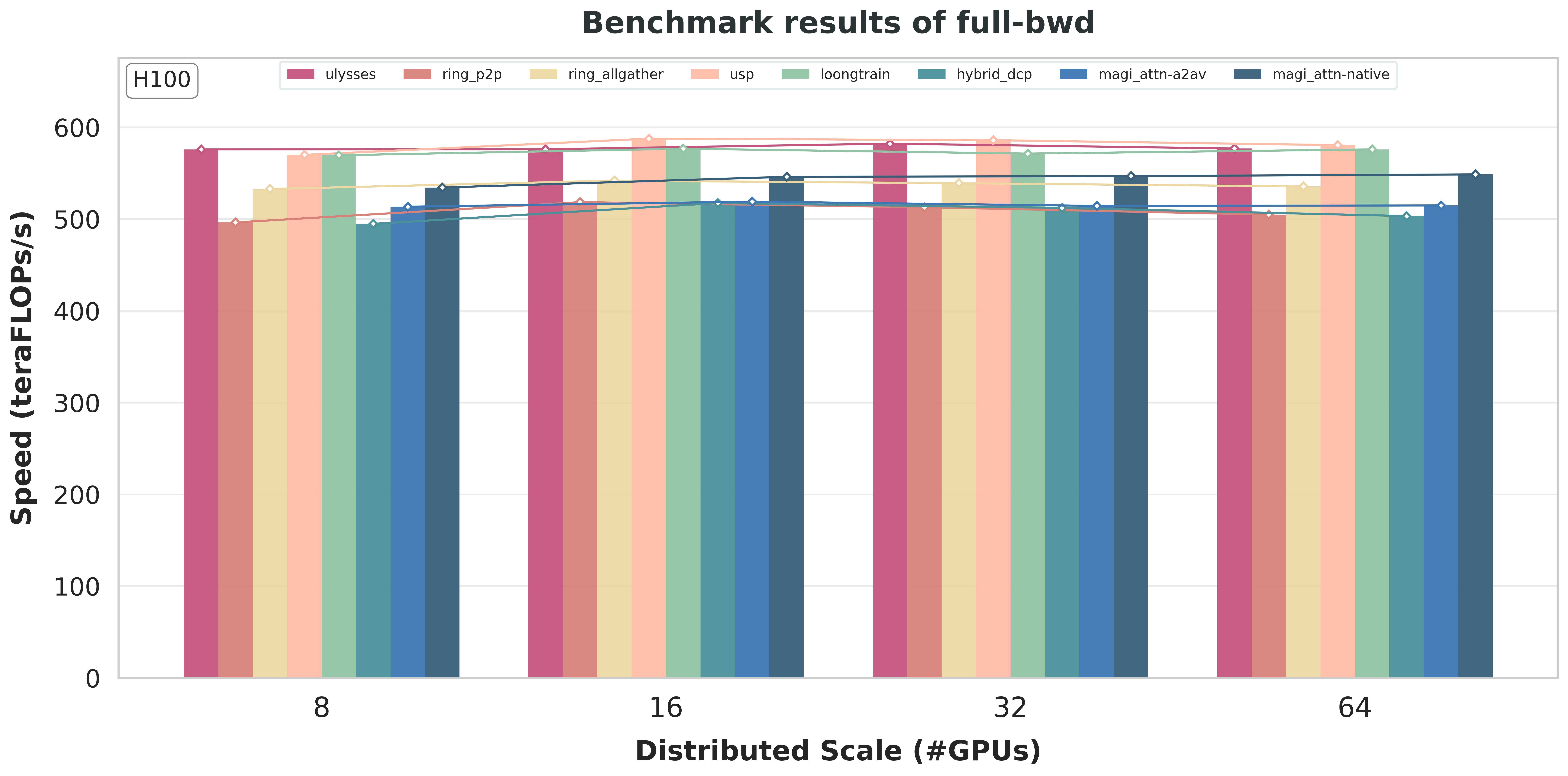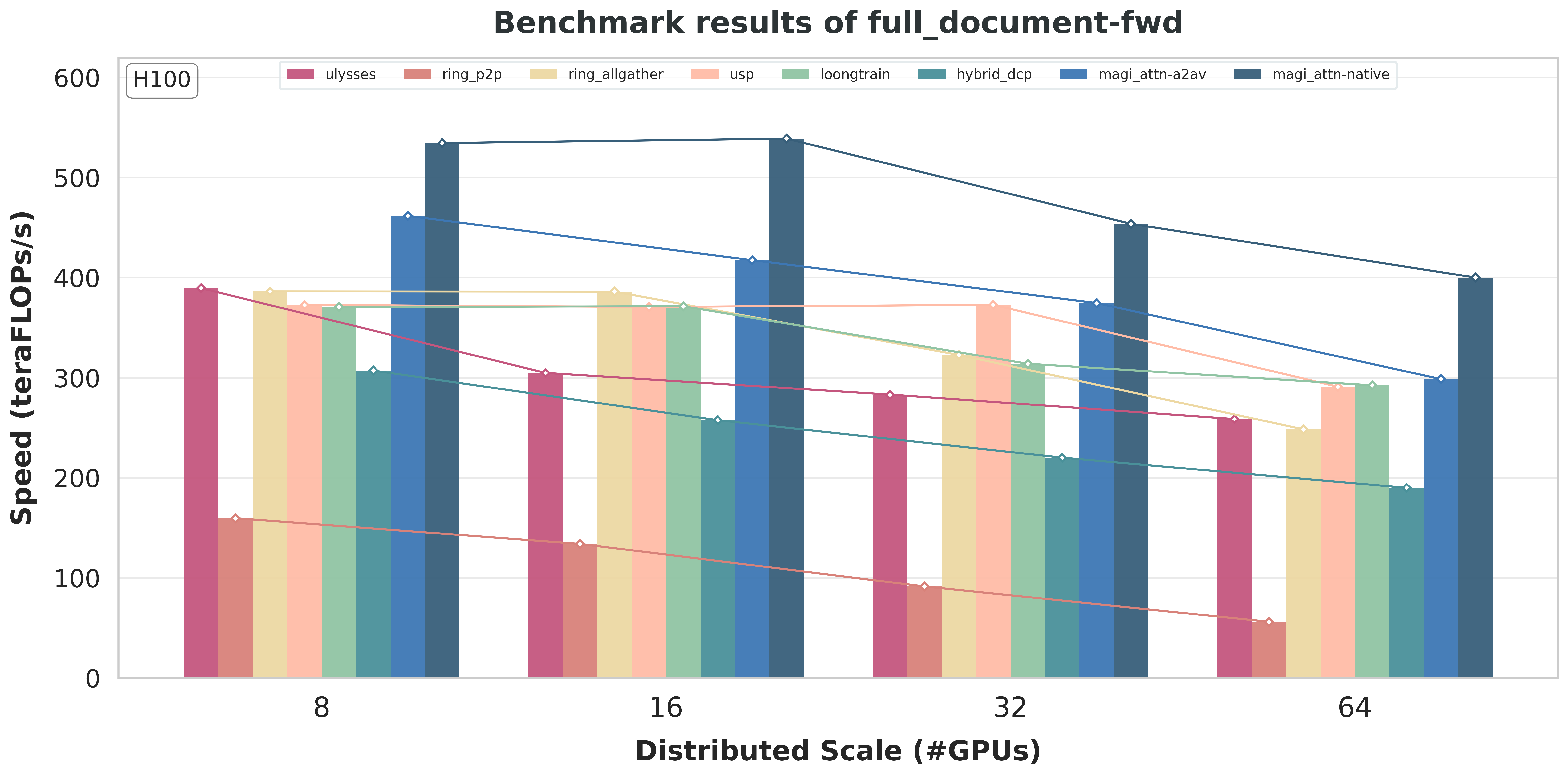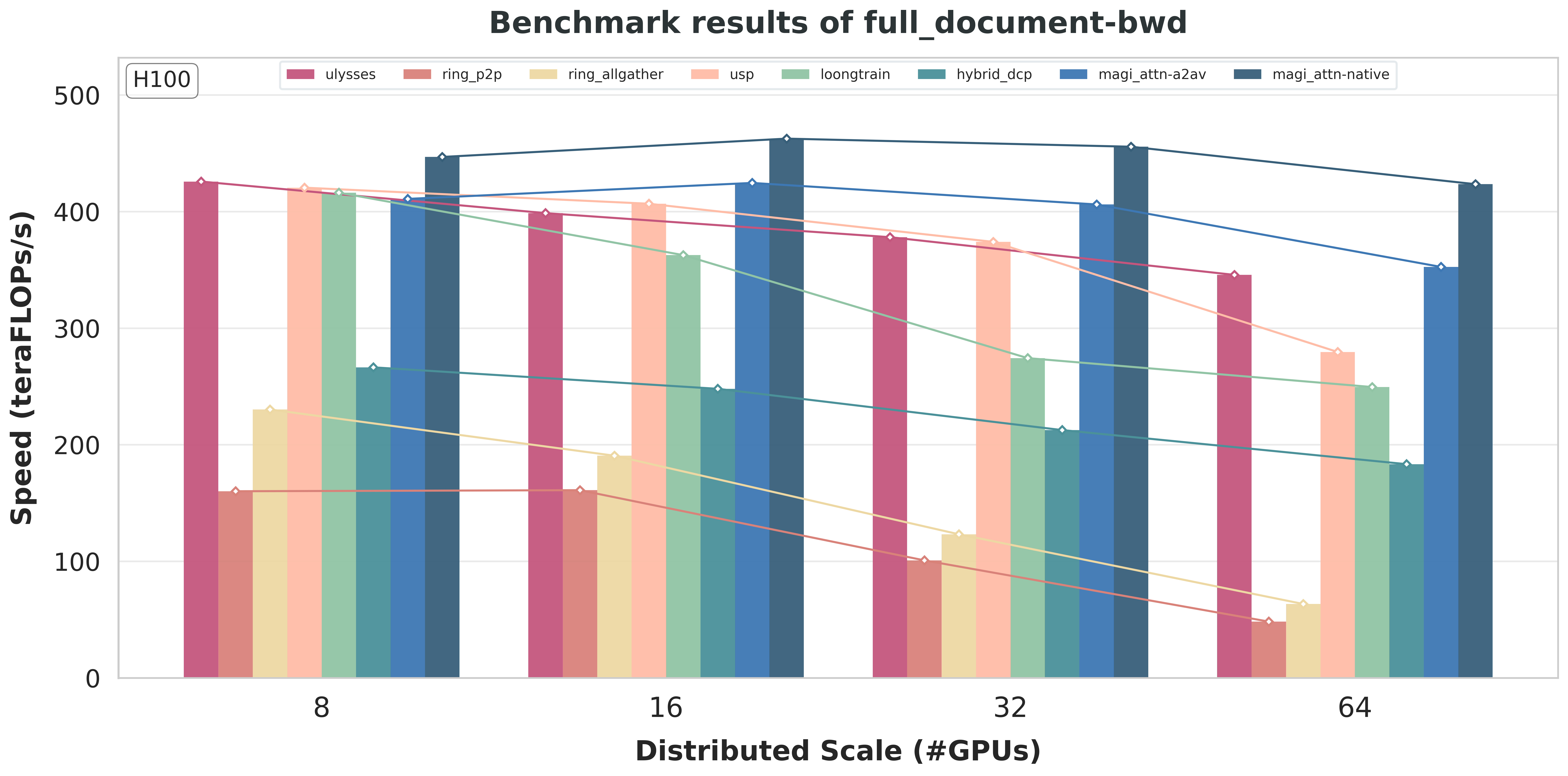For MagiAttention, we include two instances with different backends of group collectives: one using the original AlltoAll-v-based implementation and the other using native kernel based on DeepEP [Zhao et al., 2025], to demonstrate the significant gain from our new native backend.