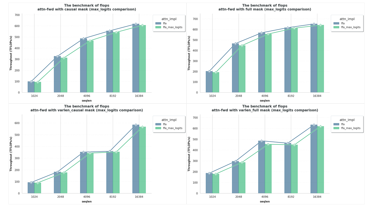 As shown in the Fig. 60 below, throughput with max_logits remains close to the baseline: roughly 1%~2.5% overhead for full and causal masks, and about 2%~3.5% for the more challenging varlen full/causal cases, indicating a negligible runtime impact from computing and returning max_logits.